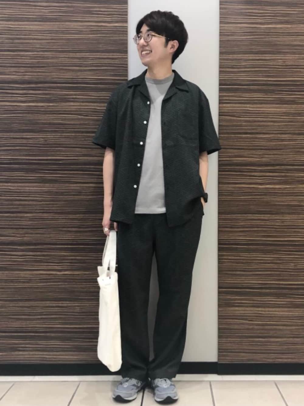 柄物セットアップで夏らしく決めてみました。色が暗めのグリーンなので派手過ぎないのもポイントです! 商品名: ジオメトリックプリントショートスリーブシャツ サイズ感:Sサイズ着用。そこまで大きくないので普段の着用サイズで着ていただくとジャストだと思います。ゆったり着たい方はワンサイズアップで! 素材感: ポリエステル100%でサラッとしていて着心地◎。お洗濯も出来、シワもつきにくいのでケアも簡単です!