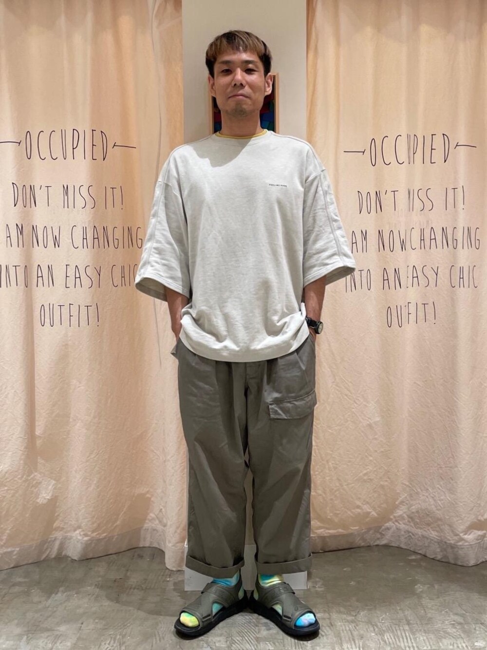 上下ともゆったりしたサイズでリラックス感を。広めの袖がいい感じです。 商品名:【WEB限定】FEELING MADE ソフトミニ裏毛 パイピングショートスリーブTシャツ サイズ感:ワイドボディでアームホールも広いので楽ちんかつお洒落なシルエットです。 素材感:柔らかくて軽さがあります。