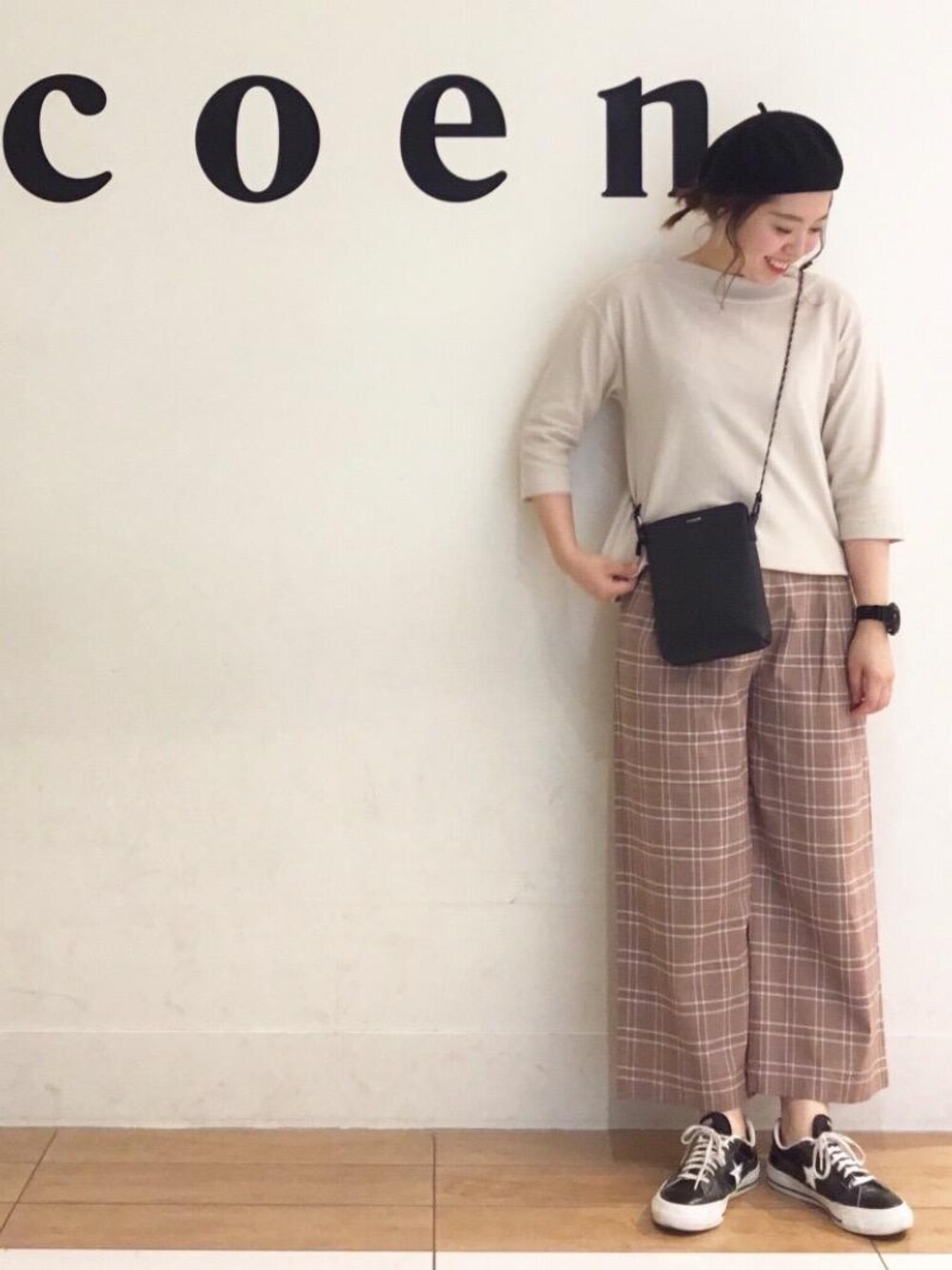 店頭でも大人気なボトルネックのトップスは首がつまりすぎずゆったりと着れるのでおすすめな1枚!ベージュトーンで合わせて柔らかい雰囲気に◎