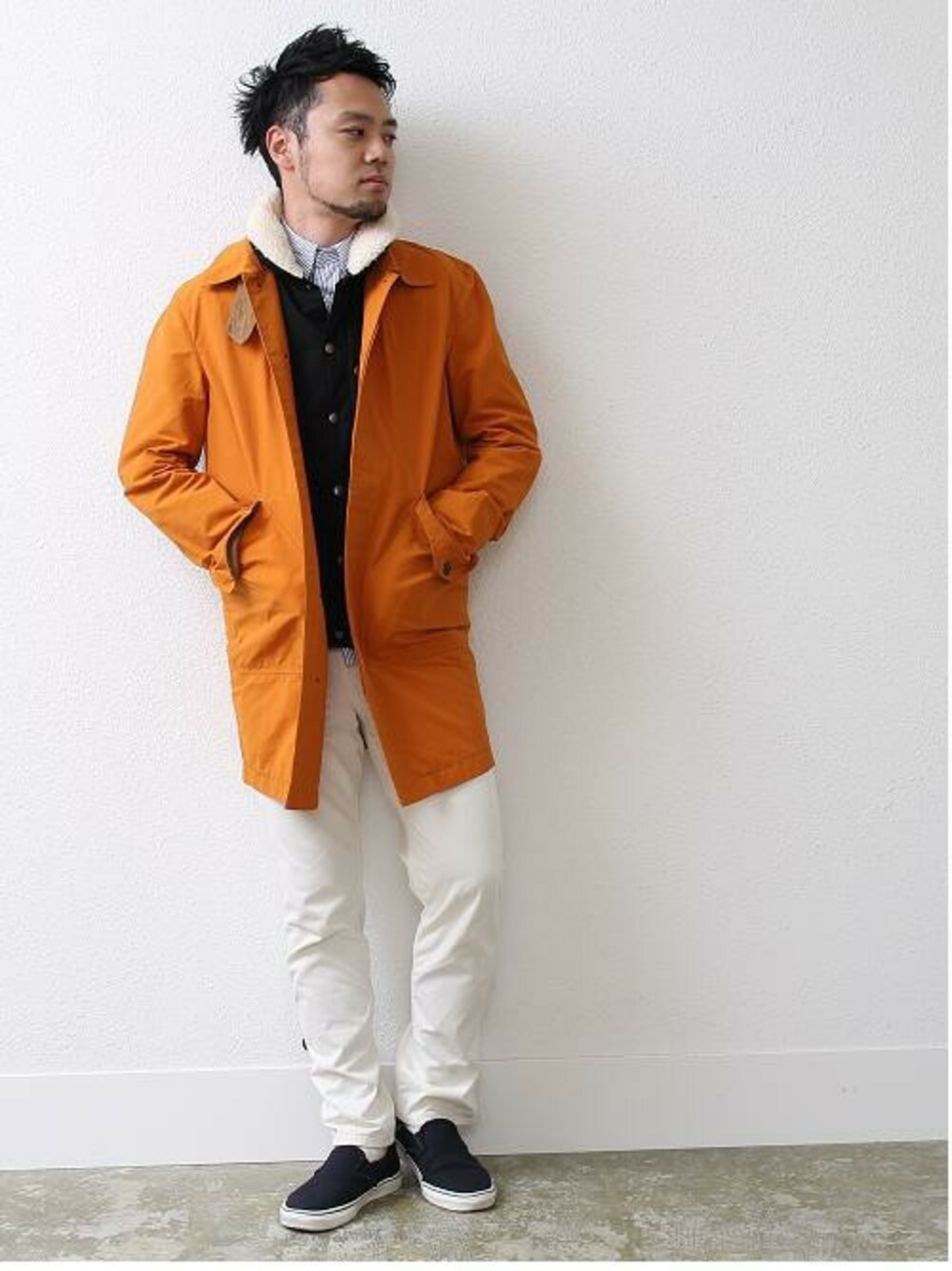 ダークになりがちな秋冬コーディネートを、アウターとパンツを明るめのカラーをチョイスすることでポップに着こなしたコーディネート。 インナーはボア付きのダウンベストを重ね着し、色に締りを与えてました。