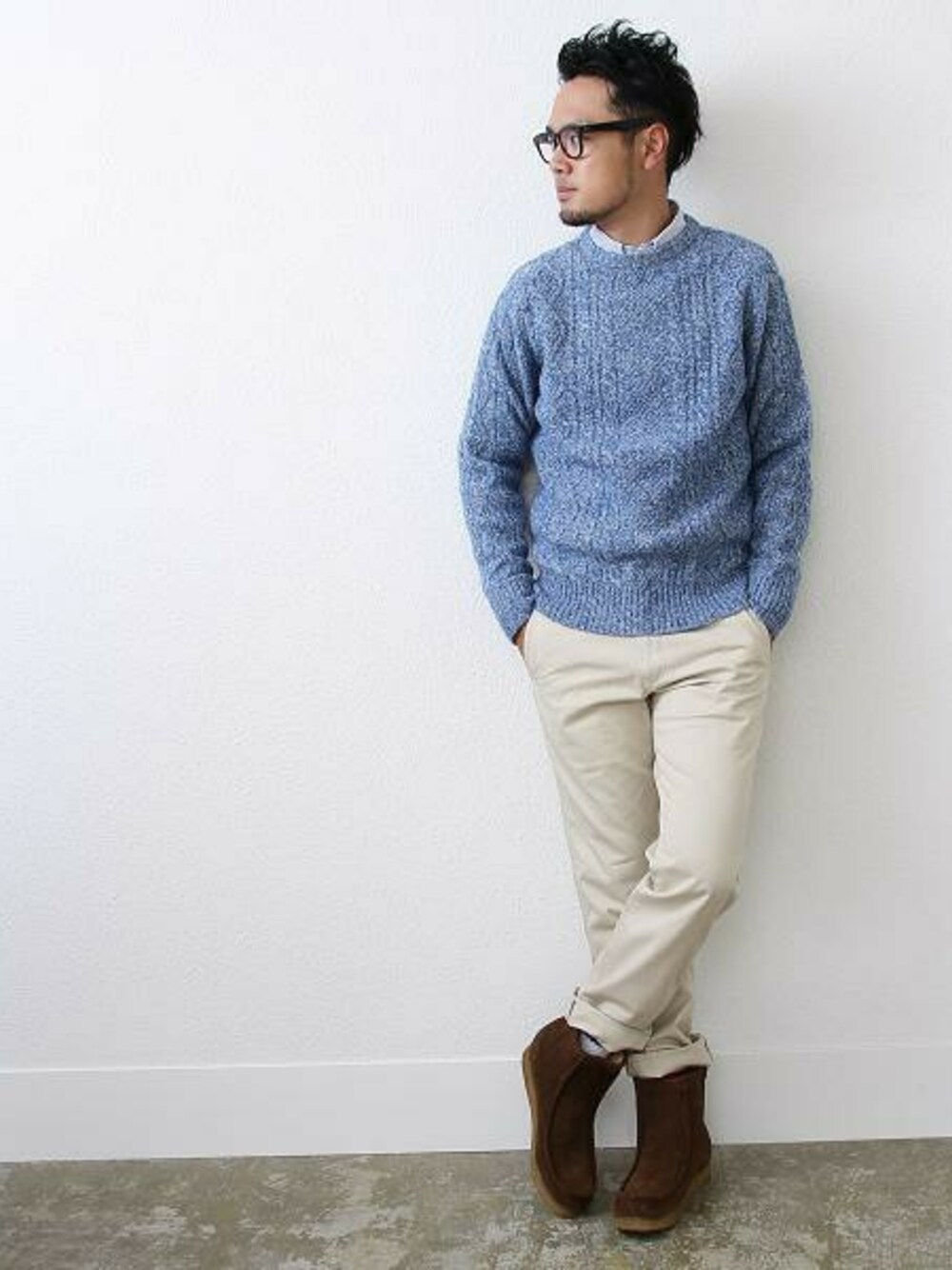 ローゲージ風のざっくりと編み上げた、定番のケーブル編みニットをメインにコーディネート。 ニットには珍しいブルーをチョイスし、インナーはストライプのブルー色で統一。 足元はロールアップ&スエードモカシンを合わせ、旬なスタイリングに仕上げた今季イチオシコーデ。