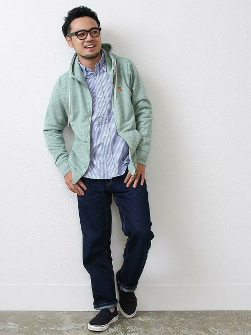 パーカーをメインにしたデイリーカジュアルコーディネート。 カジュアルなスタイリングながら、パーカーにはゴールドのダブルジップを使用し、シックなストライプシャツを合わせることでシンプルながらも高級感の漂うコーディネートに仕上げました。
