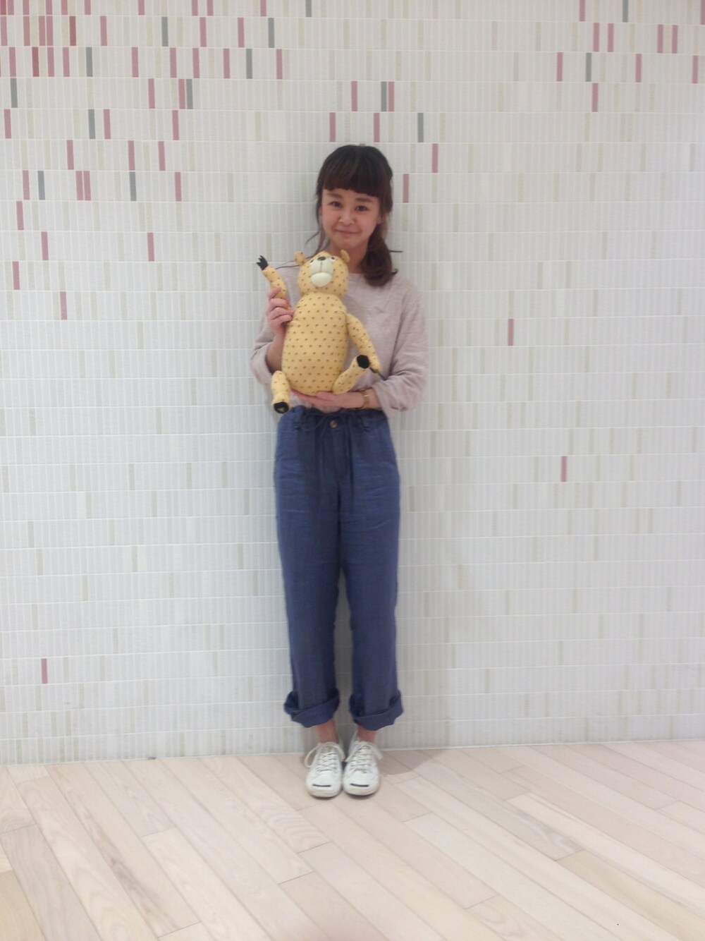 メンズの綿麻ニットは襟ぐりが詰まっててお気に入りです☆ ワイドパンツをINしてスッキリまとめてみました♪