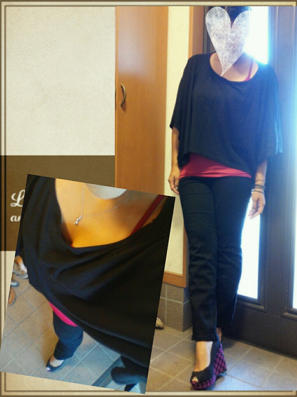 ブラック系のトップス、レッド系のトップス、ブラック系のその他パンツを着用したレディースの秋コーディネートの1枚目の写真
