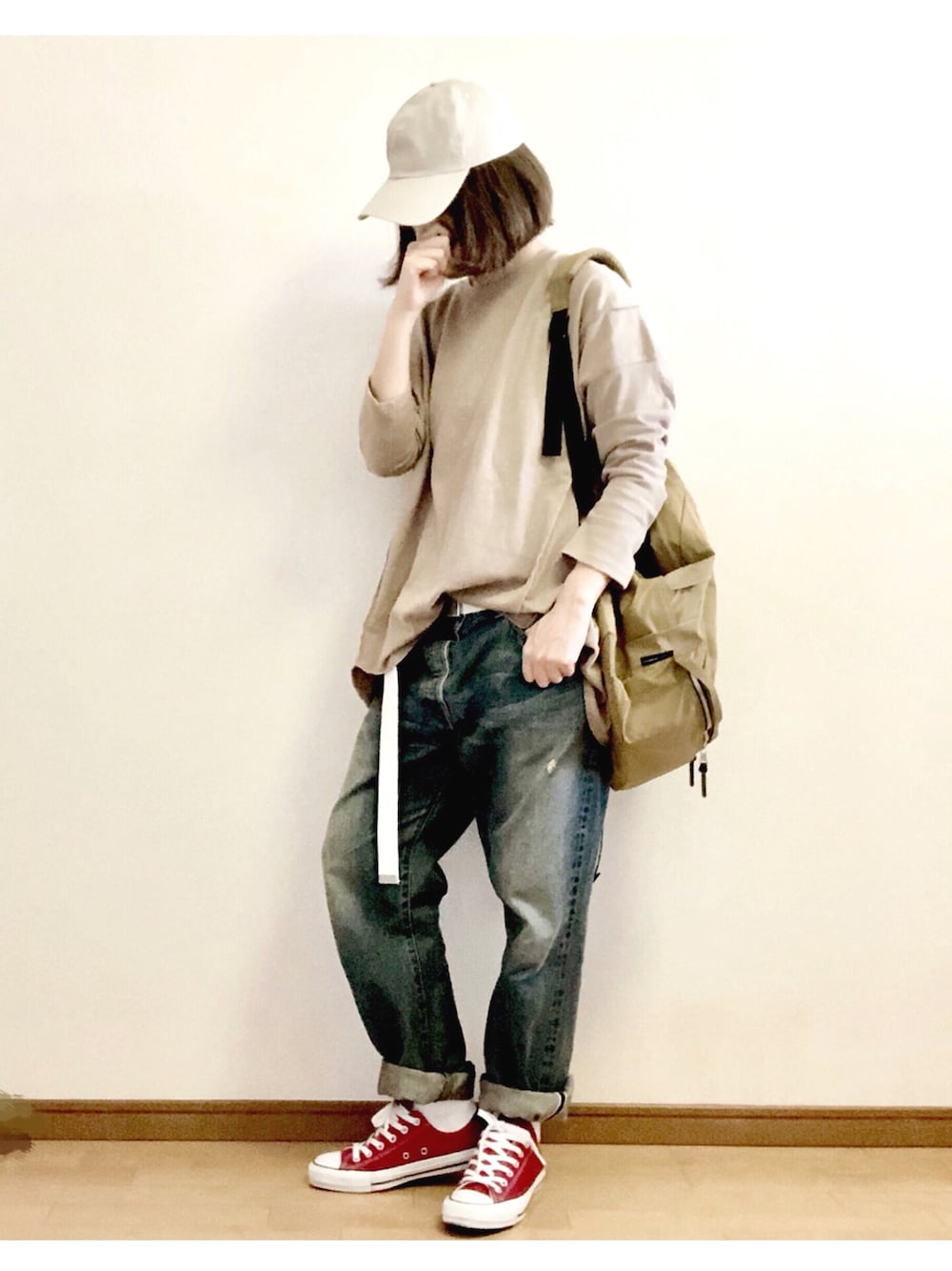 recaのロングカットソー。 着てると裏返しだよ言われるデザインのヤツ。 家族が毎回言うのやめろ(꒪⌓꒪) ベージュ×赤コン🙆♀️
