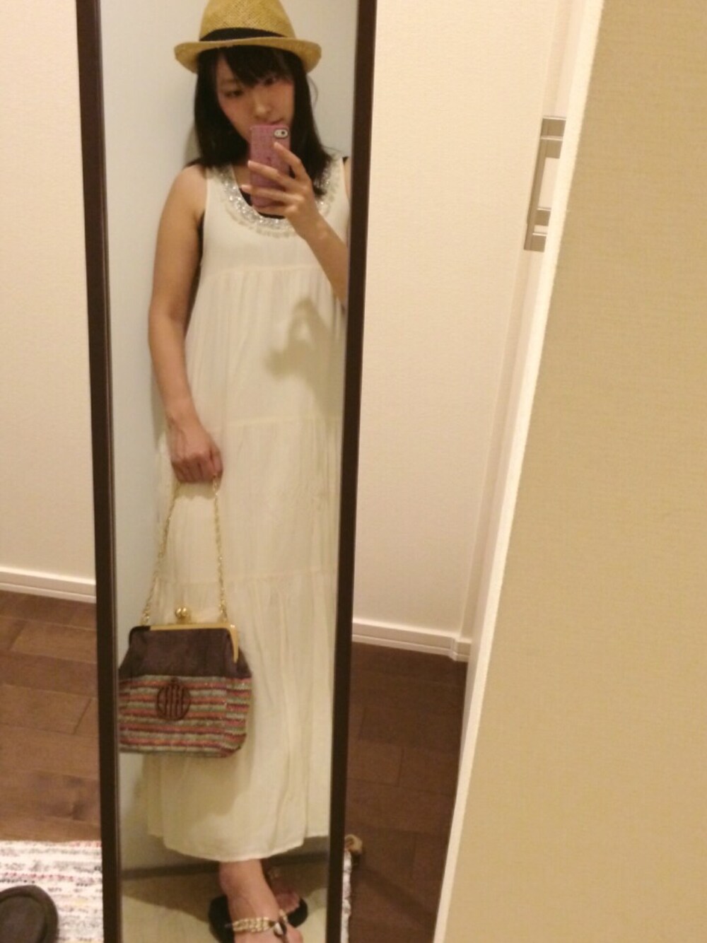 こんにちわ⭐️ 台風が来ていたり、今日はちょっと肌寒いですね☔️ そんな中、夏コーデをしちゃいました😊🌻 梅雨はすごく苦手なので、 コーデだけでも元気に夏気分で😋 胸元には、フリンジやビーズがついていて、アジアンテイストのロングワンピです😍 ふんわりしていてとてもリラックスできます。 見えにくいので、アップで写真を撮ってみました😚💕 バカンス中のイメージです❤️ ゆっくり過ごしたいですね🐠そんな事ばかり考えてる私です、笑。