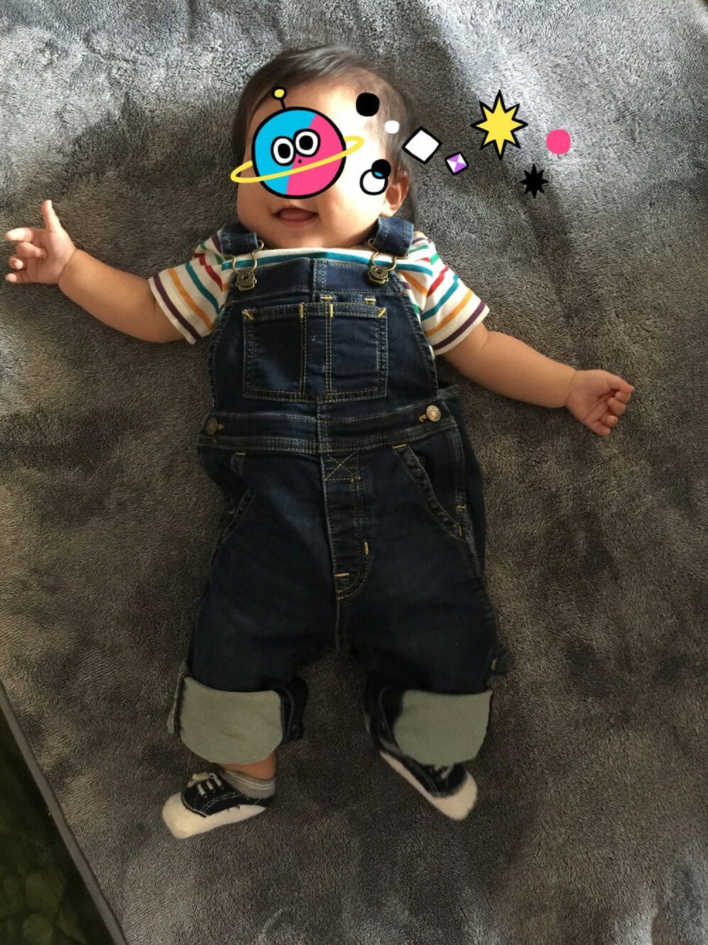 オーバーオールゎ実家のお母さんからのプレゼント 👶🏻🎁 まだ少しサイズが大きいので裾ゎまくって履いてますw