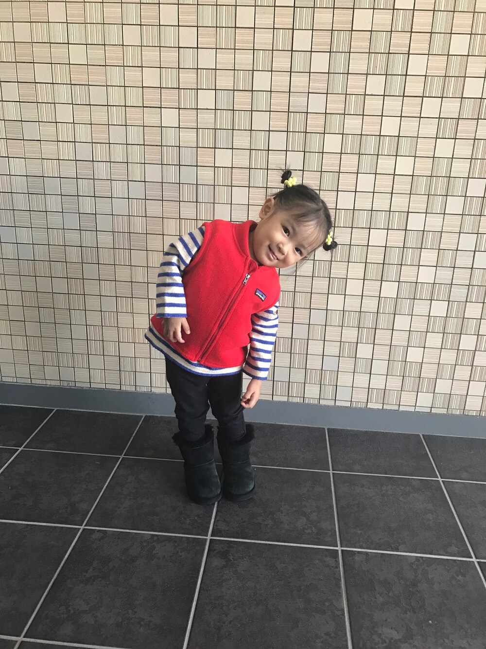今日のコーディネート☆ 1歳の頃に買ったトップスとベスト。。 何回も折って着てたけどついにピッタリになりました(*´-`)