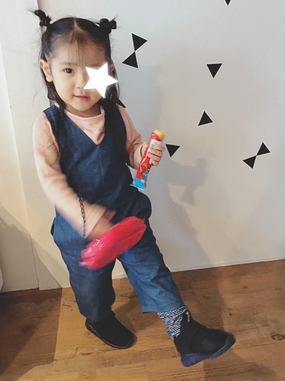 今日のコーディネート☆ 最後にもう一度着せてみたコーデ😚 80サイズのオールインワン無理やり着せてみましたーw パツパツ+パンツだから不機嫌です😅 最近スカートしか履いてくれず私の好きなパンツコーデを拒否される日々… なのでうまい棒を持たせて何とか😋 身長伸びたなぁ〜と子どもの成長を感じますっ💗