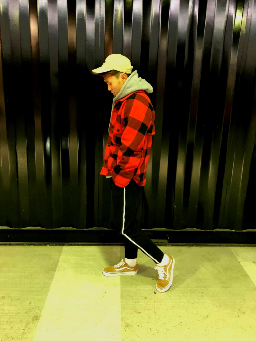 ストリートとアメカジの組み合わせ。 チェックのアウターはマッキノーまた マッキーノジャケットともいいます。 こちらも前回同様キャップとスニーカー を同系色でまとめました。 ストリート7:3アメカジ。