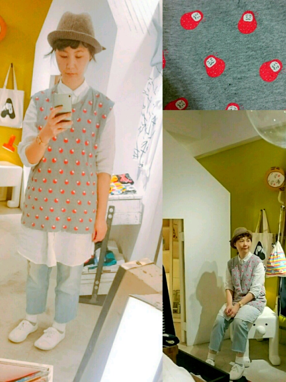 買了可愛的XL size 大大T恤 將兩邊袖子剪去時 會出現寬大的袖攏 型成特別版背心 平日 可以搭配各式剪裁襯衫與短袖 它長長的衣擺 可以將璞實的版型 作出T恤以外的有趣穿搭。 今天搭配的咖啡色小紳士帽子 為可愛的T恤多加了一點點正式的風味。 感覺整體看起來 今天是一個有禮貌的人 \哈/