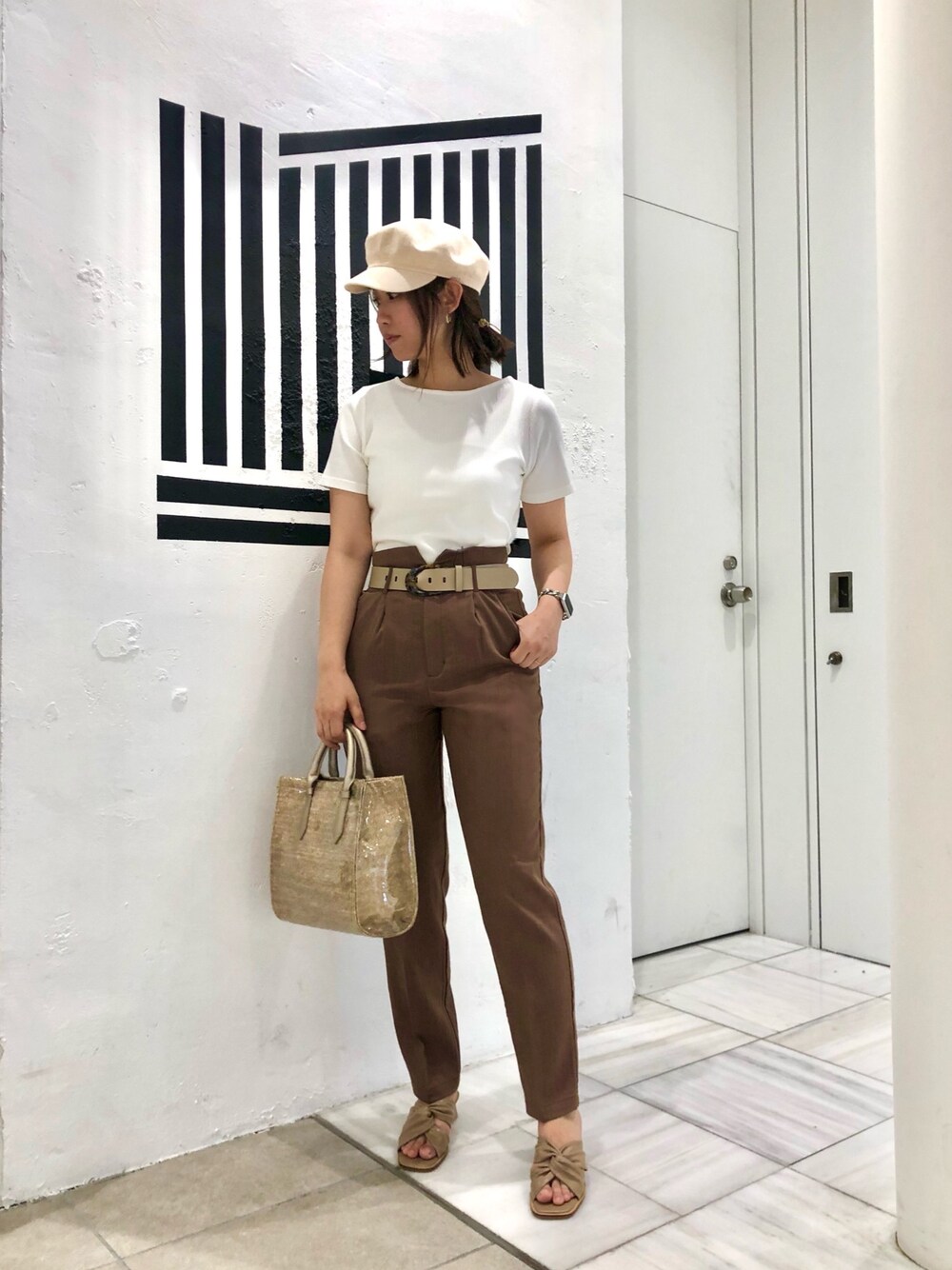 ご覧いただきありがとうございます☺︎ 足長く細く見えるハイウエストパンツで ワントーンコーデしてみました❤︎ 麻のような素材で涼しいですし、 ウエストゴムで履き心地も快適です!