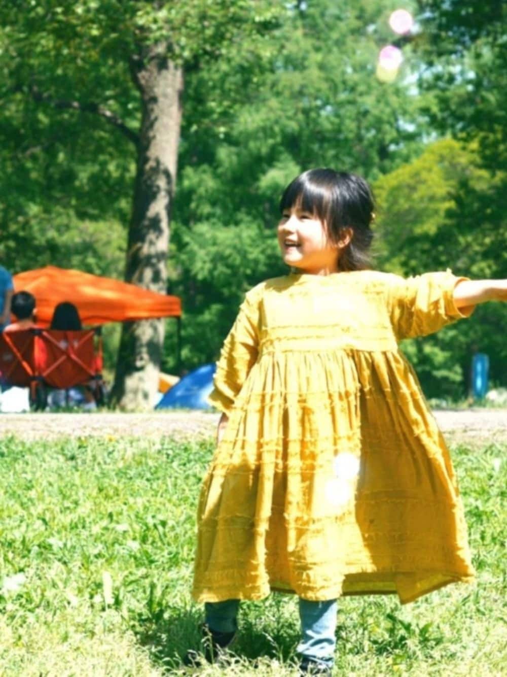 イエロー系のワンピース、ブルー系のデニムパンツを着用したキッズの夏コーディネートの1枚目の写真