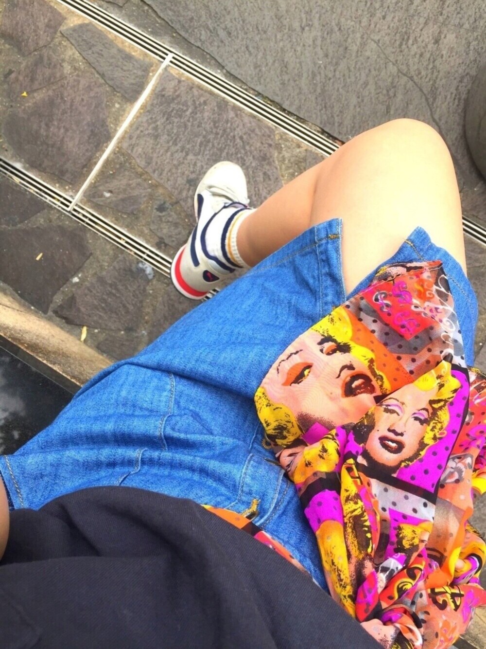 ぽっちゃりもたまには膝上履きます。 すんません。 見えませんが、抜き襟という流行り技も取り入れてみました。 すんません。 自転車乗って、おかゆセット食べて、野菜買って、ジェラート食べましたコーデ🚲🍚🥕🍦