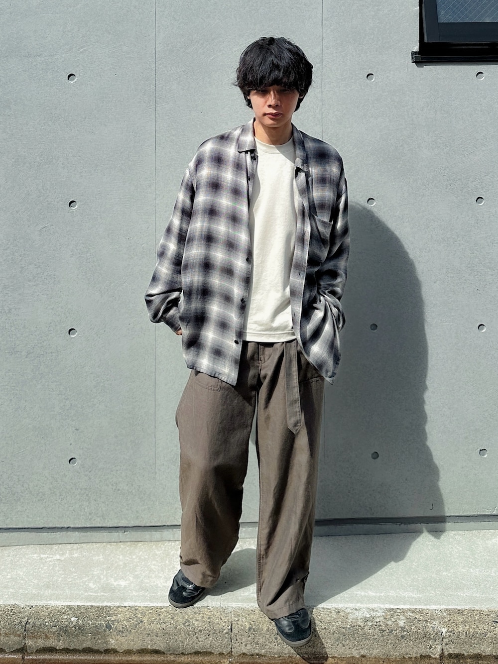 平莉川己夢(コム)のカーゴパンツ「WOOL LINEN BELTED PANTS」を使ったコーディネート