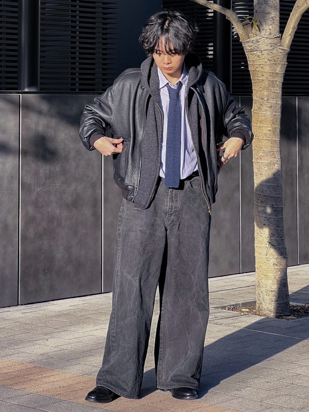 平莉川己夢(コム)のデニムパンツ「CRACK WASHED BAGGY DENIM PANTS」を使ったコーディネート