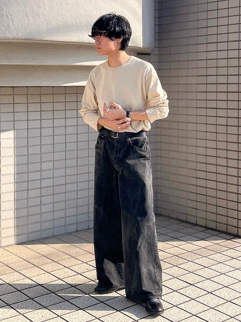 平莉川己夢(コム)のデニムパンツ「CRACK WASHED BAGGY DENIM PANTS」を使ったコーディネート