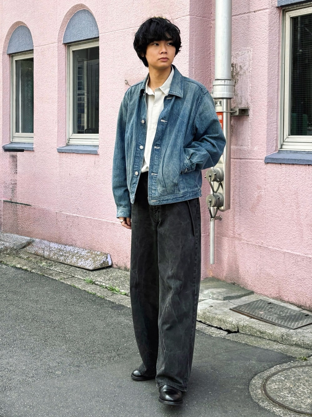 平莉川己夢(コム)のデニムパンツ「CRACK WASHED BAGGY DENIM PANTS」を使ったコーディネート