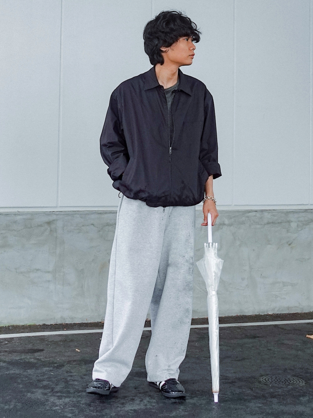 平莉川己夢(コム)のスウェットパンツ「タックワイド裾ドローコードストレートスウェットパンツ」を使ったコーディネート