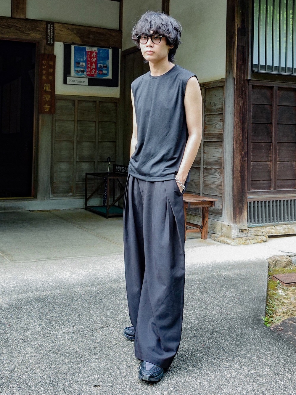 平莉川己夢(コム)のタンクトップ「MERINO WOOL SLEEVELESS TEE」を使ったコーディネート