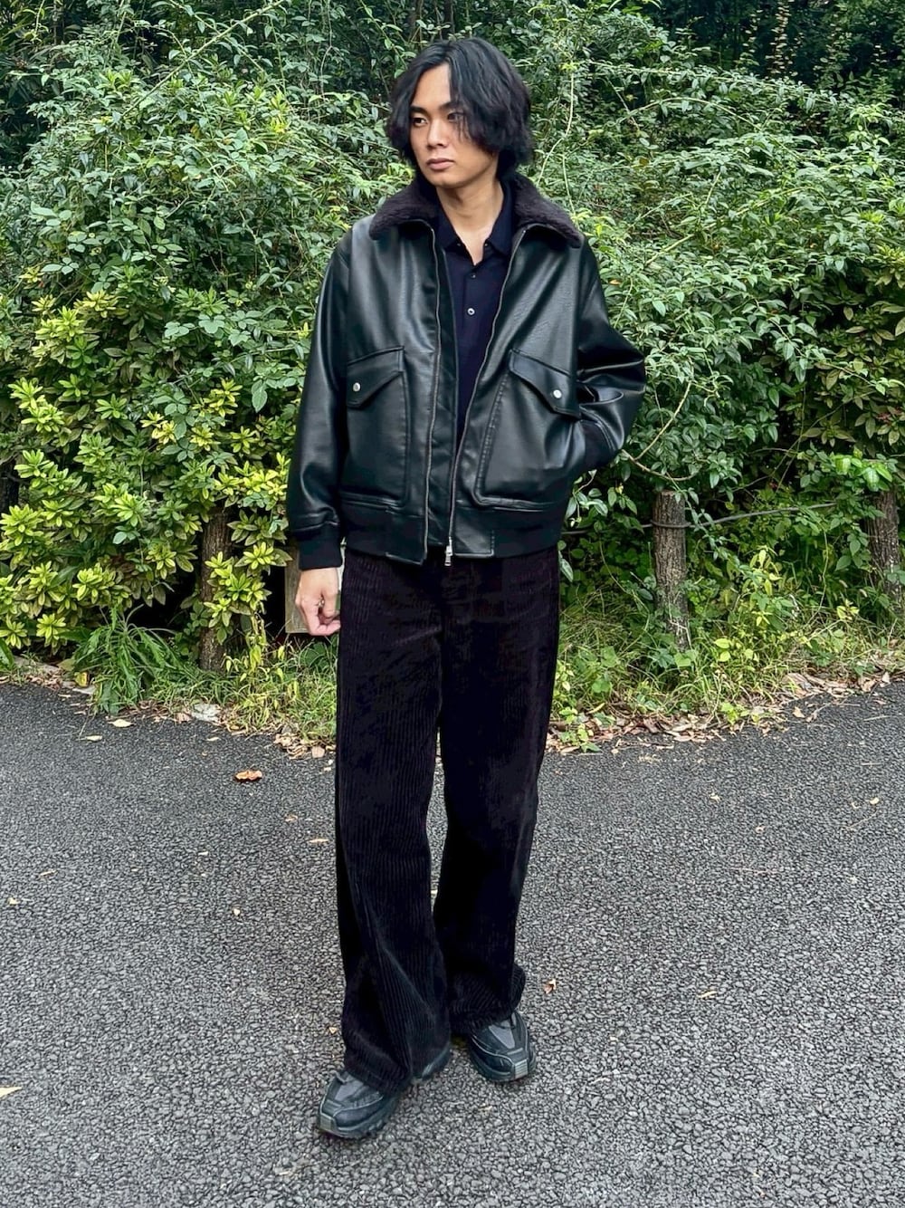 平莉川己夢(コム)のブルゾン「DETACHABLE BOA ARTIFICIAL GRAIN FLIGHT BLOUSON」を使ったコーディネート