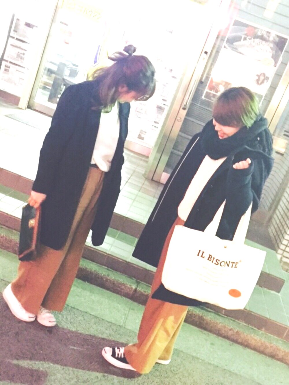 キャメルのワイドパンツ 白ニット ジャックパーセル 愛ちゃんとおそろコーデ♡