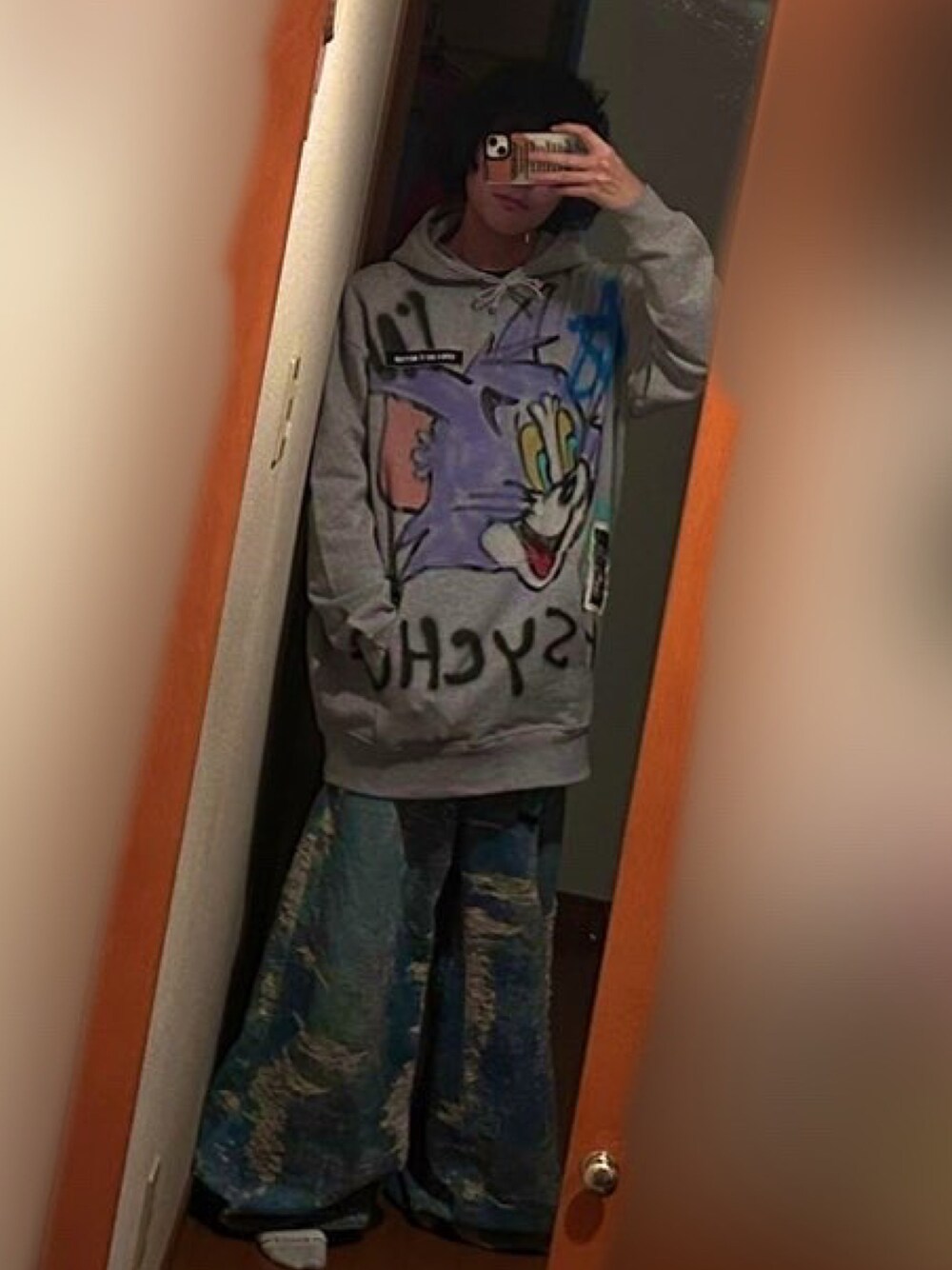 グレー系のパーカー、ブルー系のデニムパンツを着用したメンズの冬コーディネートの1枚目の写真