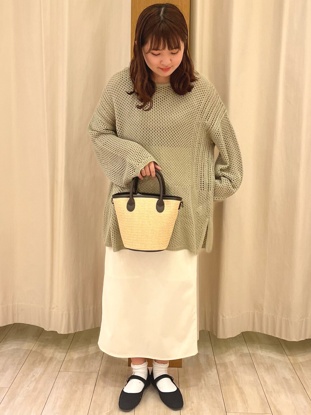 抜け感のある透かし編みニット🍀📗 春っぽいくすみグリーンの色味がとっても可愛い🫶 丈が長めでおしり周りをしっかりカバーしてくれるので、タイトめなボトムと合わせるととってもバランスが良いです◎
