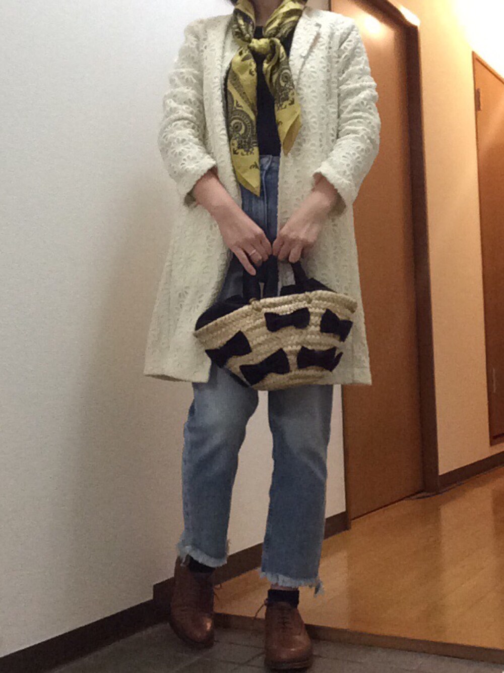 レースのノーカラーコートとリボンがたくさんついたかごバッグで甘々なところにダメージデニムで辛口ミックス