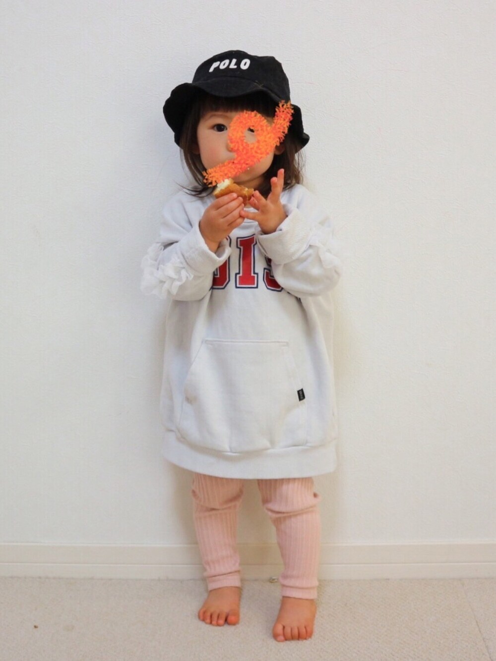 去年の帽子まだ被れますよコーデ👒 ニット帽では暑くなって来たので、 去年の帽子を被せてみたら、まだ被れた‼️ さすが、絶壁😂 まだ50センチの帽子は大きいです😰 今日は結局お家デー🏠😭 午前中、曇りかと思ったら雨降ってる😱 明日は公園行こう‼️ ドーナツ買いに行くとうるさいので、 ホットケーキミックスでドーナツ作ってみました🍩 写真撮る前に食べられた😅 そうそう。 灯油ストーブを片付けたので、真っ白な壁の前で撮影ができるようになりました😁