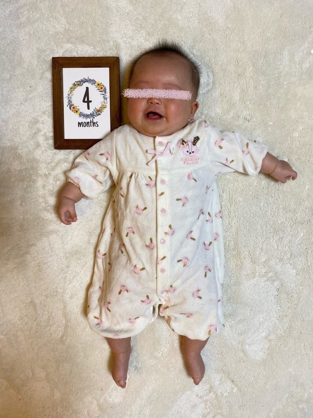 なつが4ヶ月になった日‼️ あおのお下りのカバーオールはつんつるてん😂