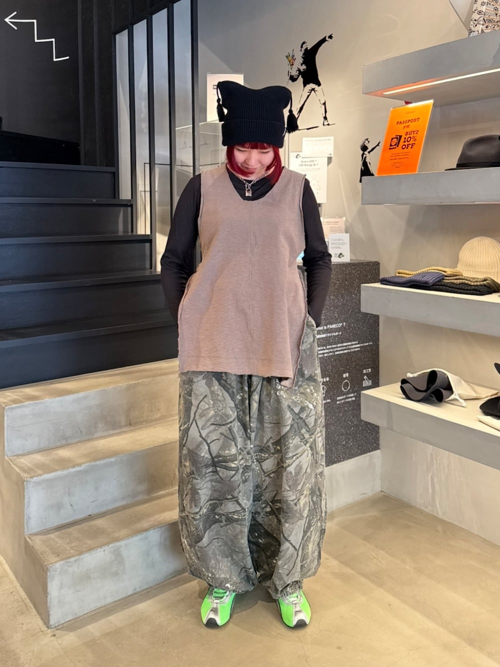 ブラック系のニットキャップ/ビーニーを着用したレディースの秋コーディネートの1枚目の写真