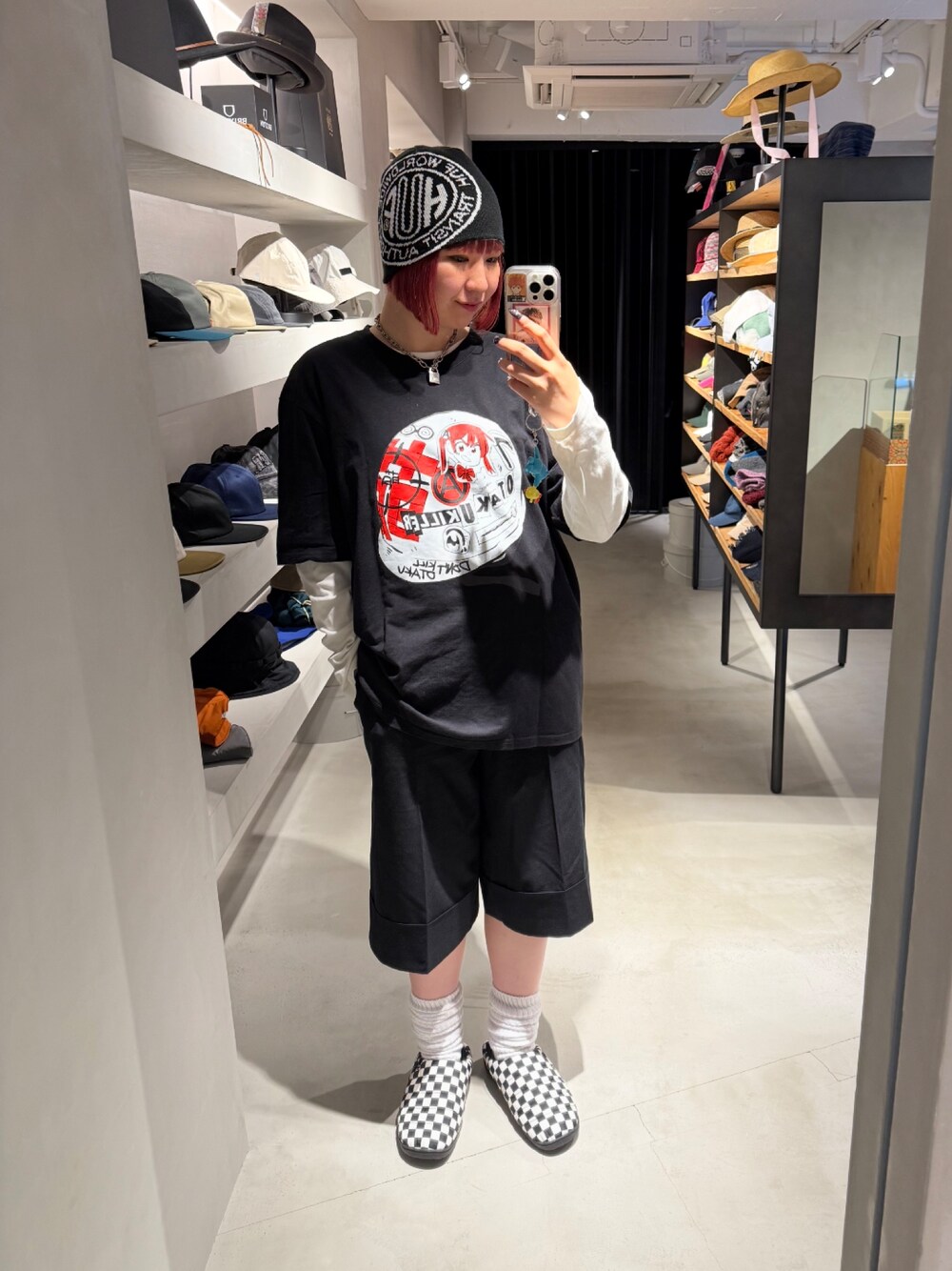 ブラック系のニットキャップ/ビーニーを着用したレディースの秋コーディネートの1枚目の写真