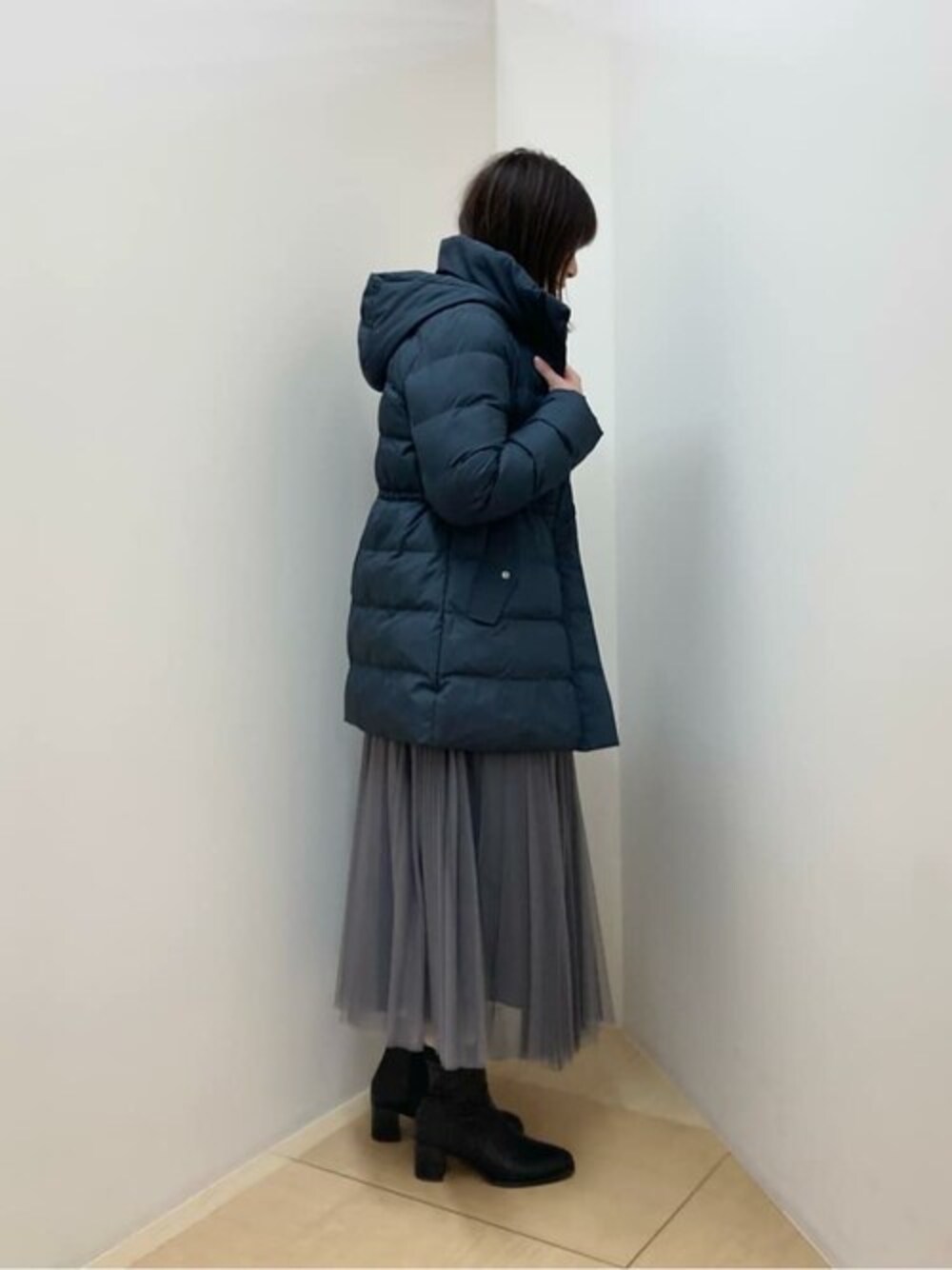 ネイビーのコートにチュールスカートで華やかさをプラス。 スカートにもパンツにもあう、程よい着丈感が◎