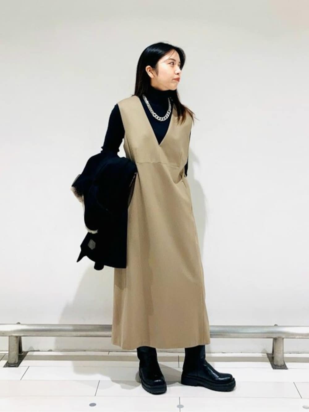 軽い着心地のAラインコート。ジャンスカと合わせ女性らしく、カラーはブラック×ブラウンの落ち着いた色のコーディネートにしてみました。 首周りはファーで包まれすごく暖かいです! 軽く着心地がいいのでお出かけにも旅行にもおすすめです。
