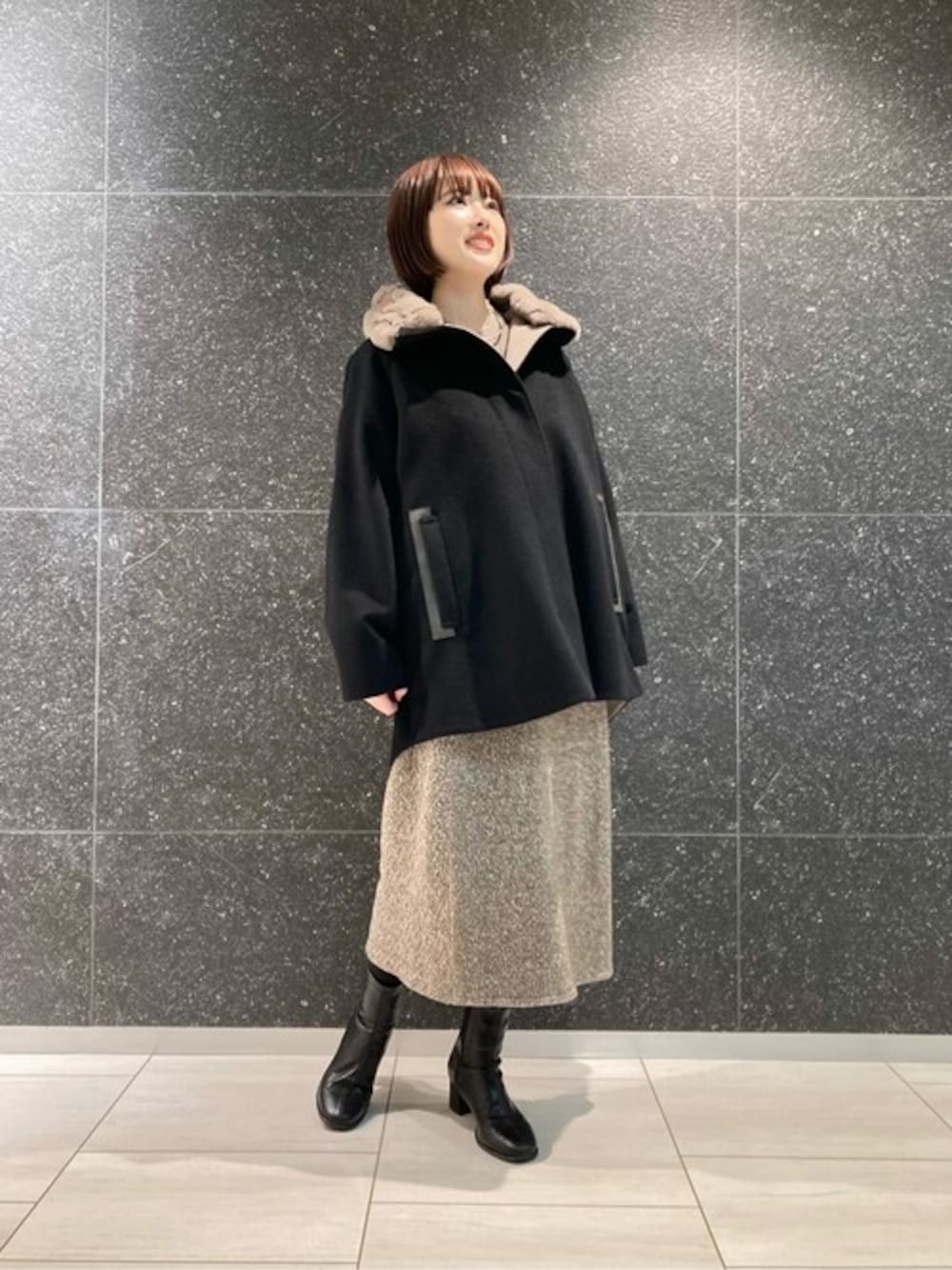 ふんわりとしたニットでありながら、タイトスカートのデザインですっきりとお召しいただけます。 ポンチョコートと合わせて冬らしい柔らかなコーディネートに仕上げました。