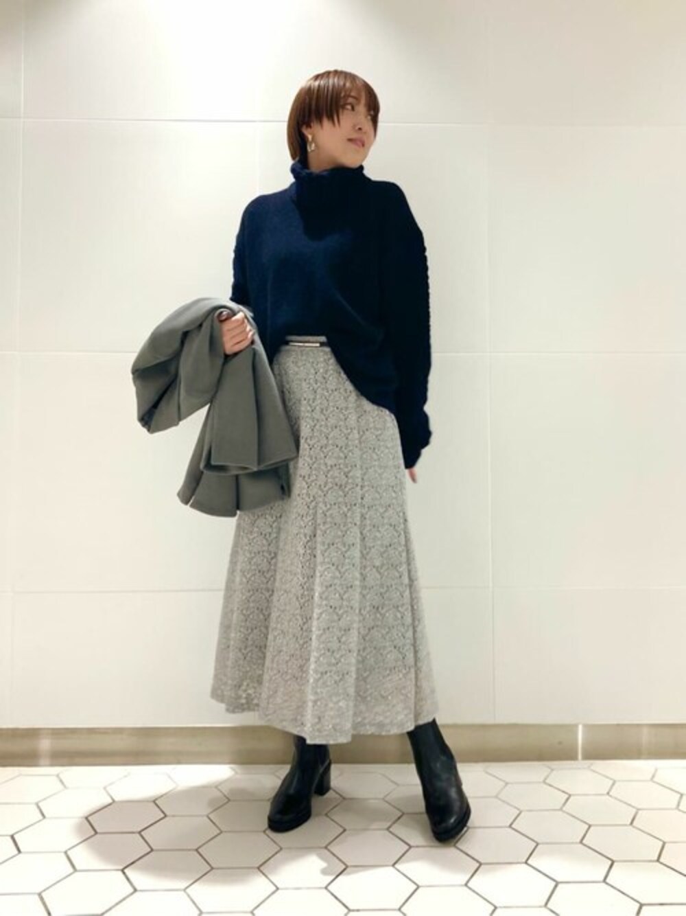 レースのスカートとゆったりニットをあわせた、エレガントなスタイリングです。 ニットは袖の網目がデザインのポイントで、シンプルながらもコーデを華やかにしてくれます。 羊毛とアンゴラなので、とても暖かいニットです!