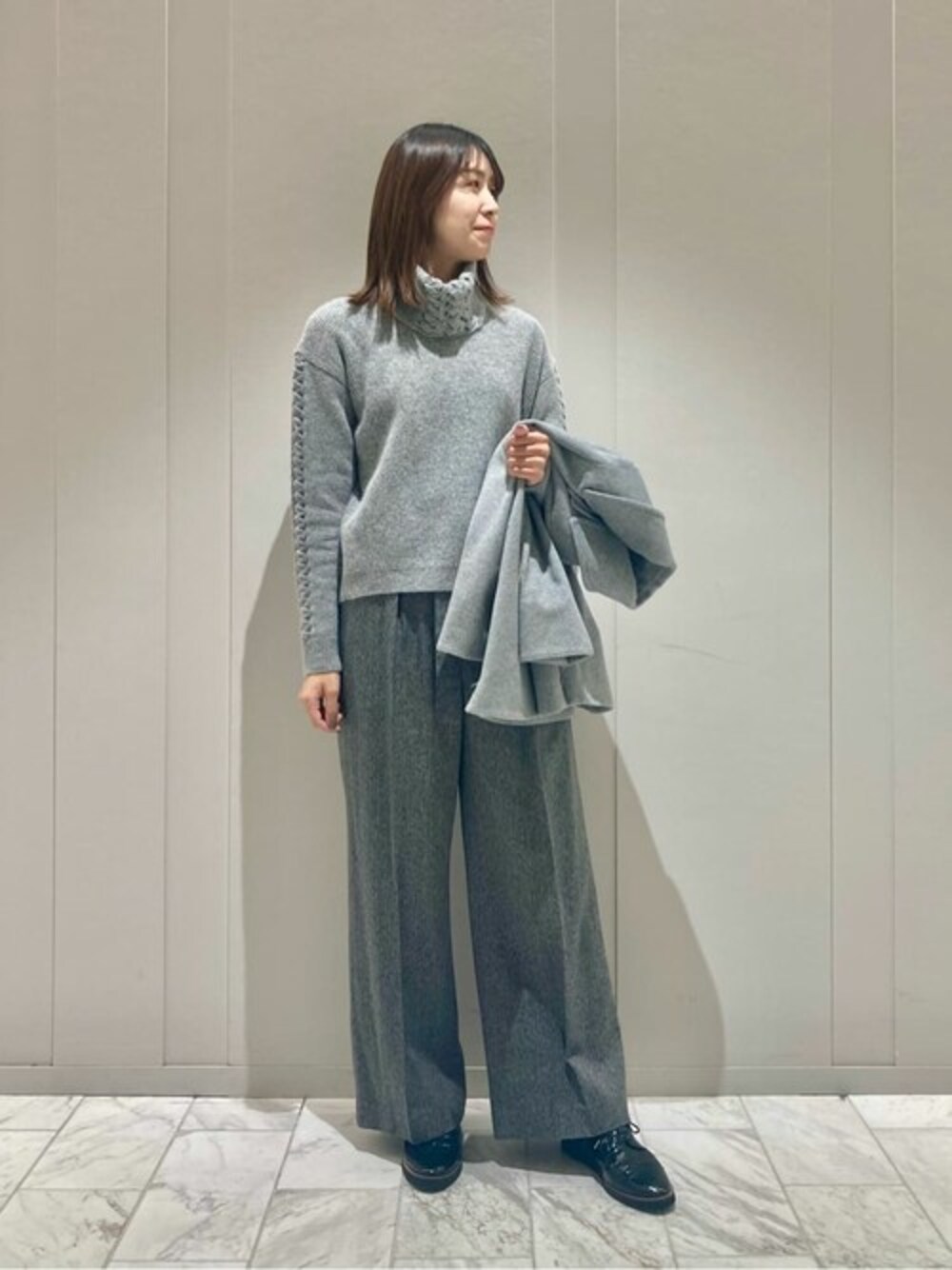 お仕事シーンにおすすめのコーディネート。 グレーのワントーンでまとめました。