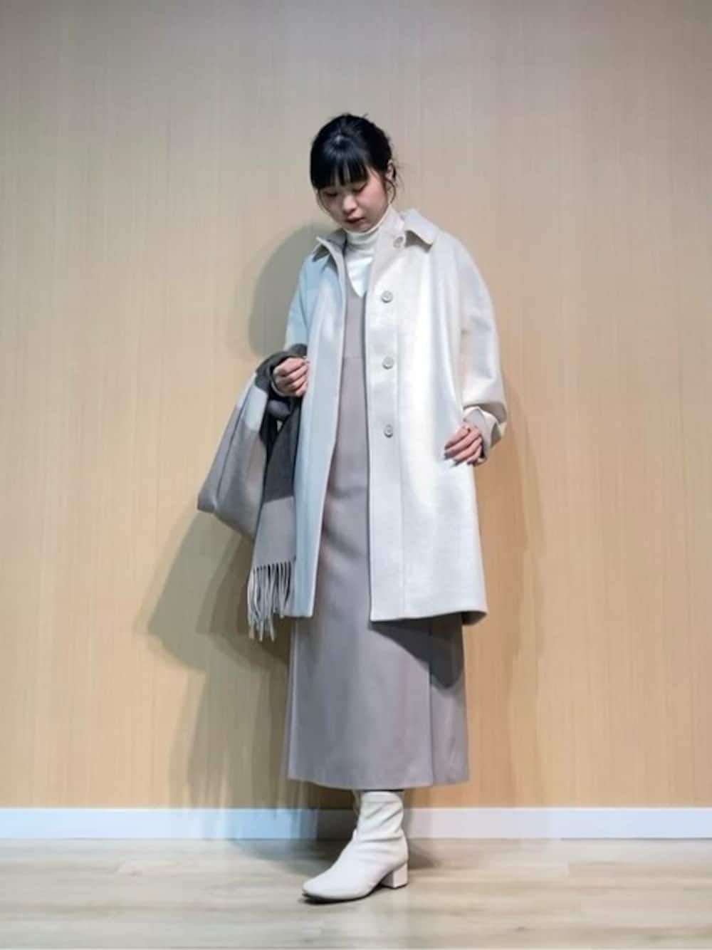 ベージュ系のワントーンコーディネートです。 K・T定番素材のアンゴラウールコートの色合いに合わせて、 インナーやワンピースも揃えて旬な着こなしにしました。 マフラーで柄を入れてコーディネートにメリハリつけてます。