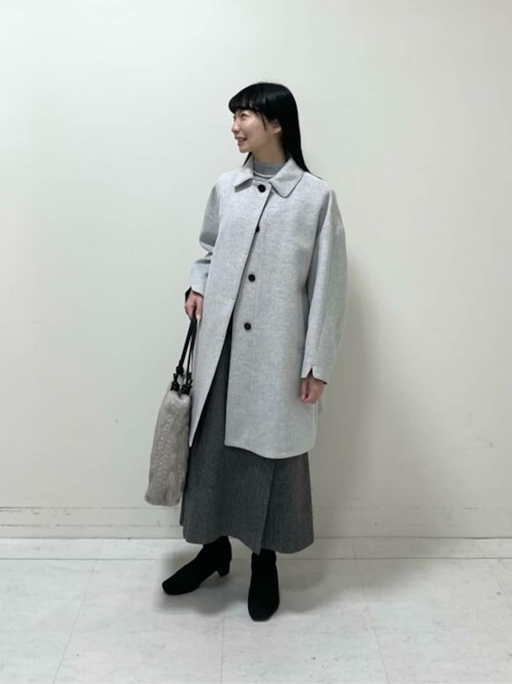 上品なグレーカラーでまとめたワントーンコーディネートです。 ステンカラーコートはブラックの配色使いをしているので、 グレーカラーを引き締めてくれます。 お出かけが多くなる季節にフェミニンな印象のスタイリングです。