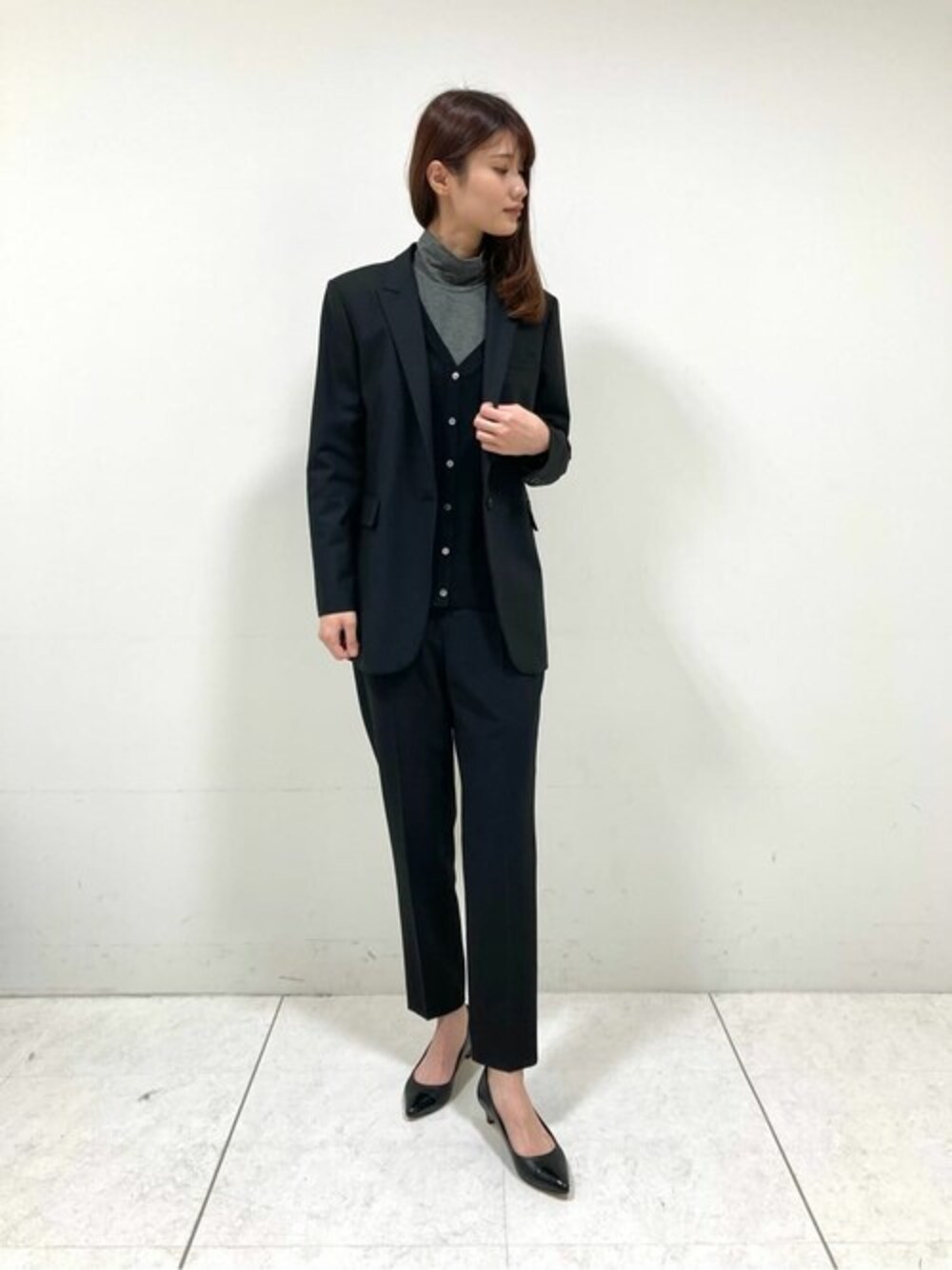 黒のジャケットは仕立てが良くとても軽い着心地です。 柔らかく暖かいカットソーと、 ジャケットインしやすい薄手のカーディガンをレイヤードしました。 モノトーンで大人な印象のコーディネートにしました。