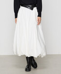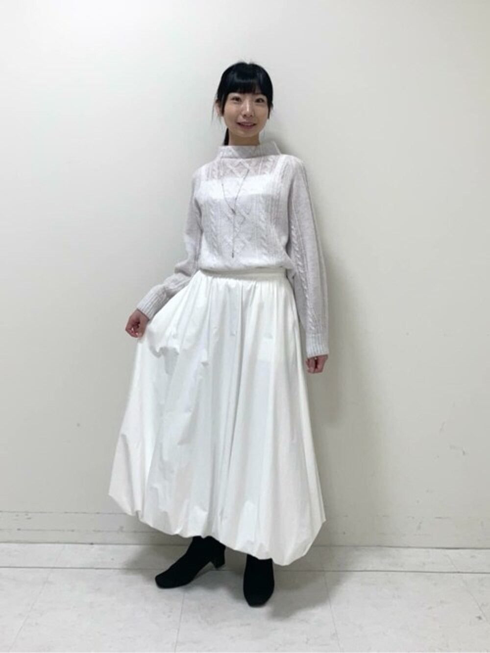 白のワントーンで、冬らしいエレガントなコーデです。 ボリュームのあるバルーンスカートですが、重たく見えず、モードな印象です! どんなニットとも相性が良いので、今季の新しいワードローブとしておすすめです!
