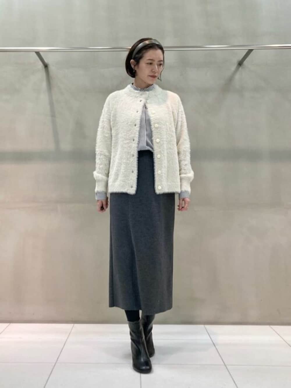 ゆったりとしたシルエットで華やかな印象のセーターにストライプのシャツを合わせて甘くなり過ぎないようにコーディネートしました。 ニットカーディガンは2WAY仕様でプルオーバーとしても着られるのでコーディネートの幅が広がります。