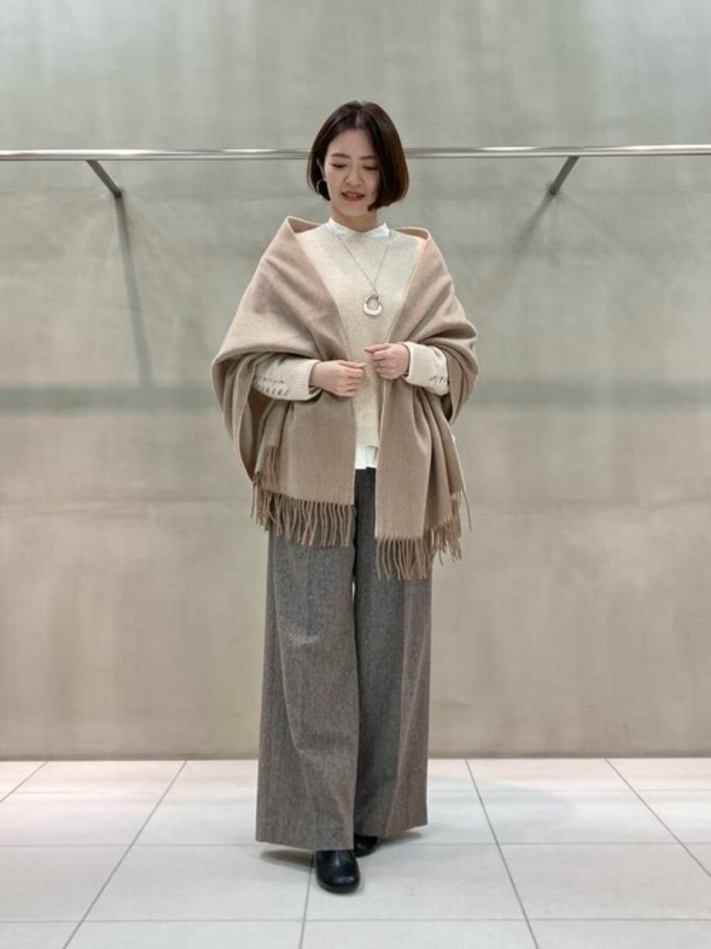ブラウン×ベージュのワントーンコーデです。 全体をブラウン系でまとめて寒くなる時期に暖かみを感じる色合いにしました。 白のブラウスを重ね着するときれいめカジュアルなお出掛けスタイルになります◎ ニットはスヌード付きなので着脱で雰囲気を変えられます。
