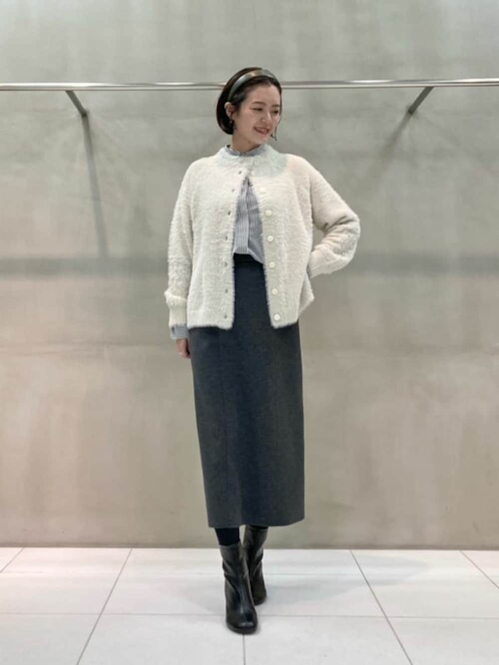 ゆったりとしたシルエットで華やかな印象のセーターに ストライプのシャツを合わせて 甘くなり過ぎないようにコーディネートしました。 程よいタイトのニットスカートがスタイルアップしてくれます◎ ニットカーディガンは2WAY仕様で プルオーバーとしても着用できるので コーディネートの幅が広がります。