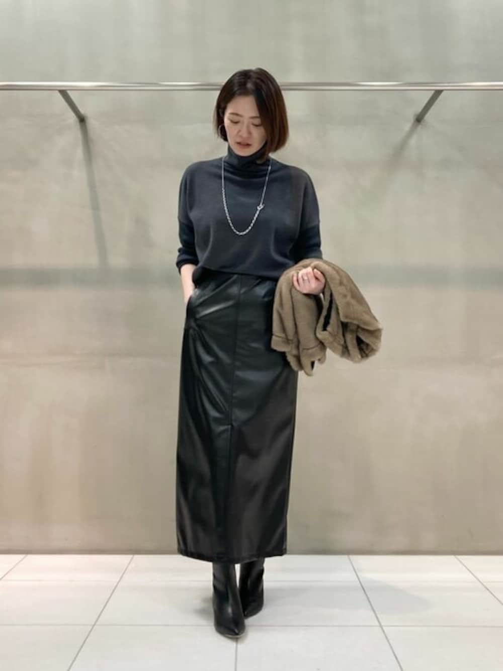 ミンク調フェイクファージレに合成皮革のタイトスカートを合わせて甘辛スカートコーデにしました。 トップスは前だけインにして着るとスタイルアップになります。