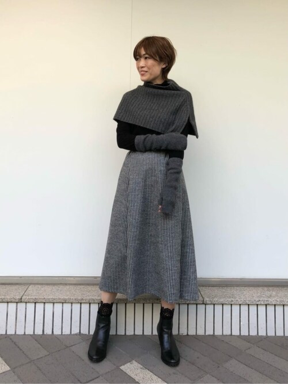 ワントーンで小物をふんだんに使ったコーディネートです。 ニットケープに、グローブは寒い時期におしゃれに見せてくれる優秀アイテムです。 この上にアウターを羽織れるのでおしゃれも防寒も両方叶えてしまうおすすめコーディネートです。