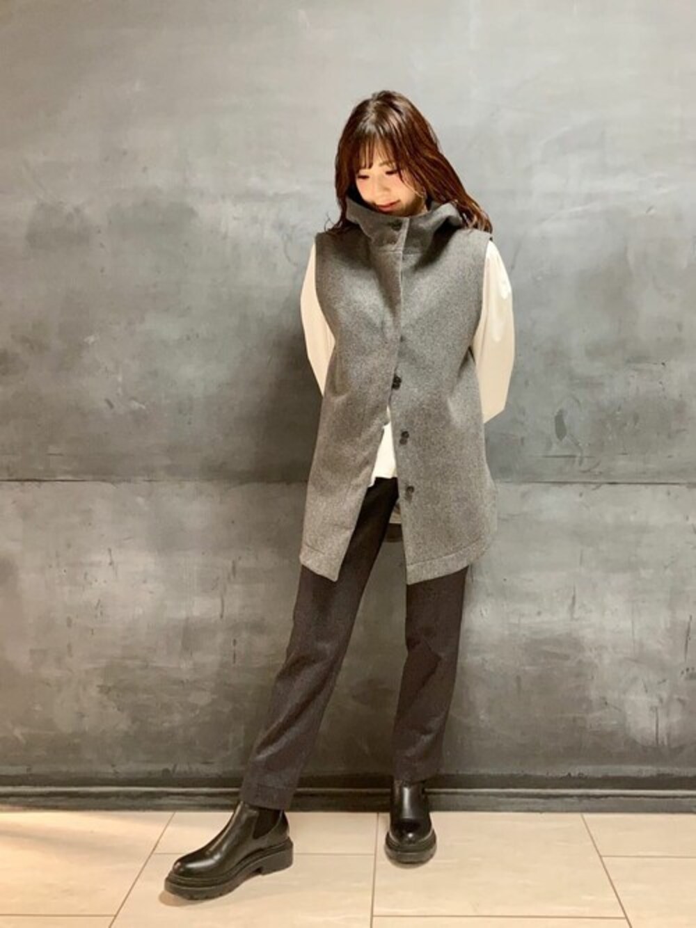 冬のアウターはモノトーンになりがちですがカーキで合わせるとスタイリングにメリハリが出て今年らしいコーディネートに仕上がります! 程よくたっぷり感があり中にジレを重ね着すれば寒さ対策もバッチリです◎