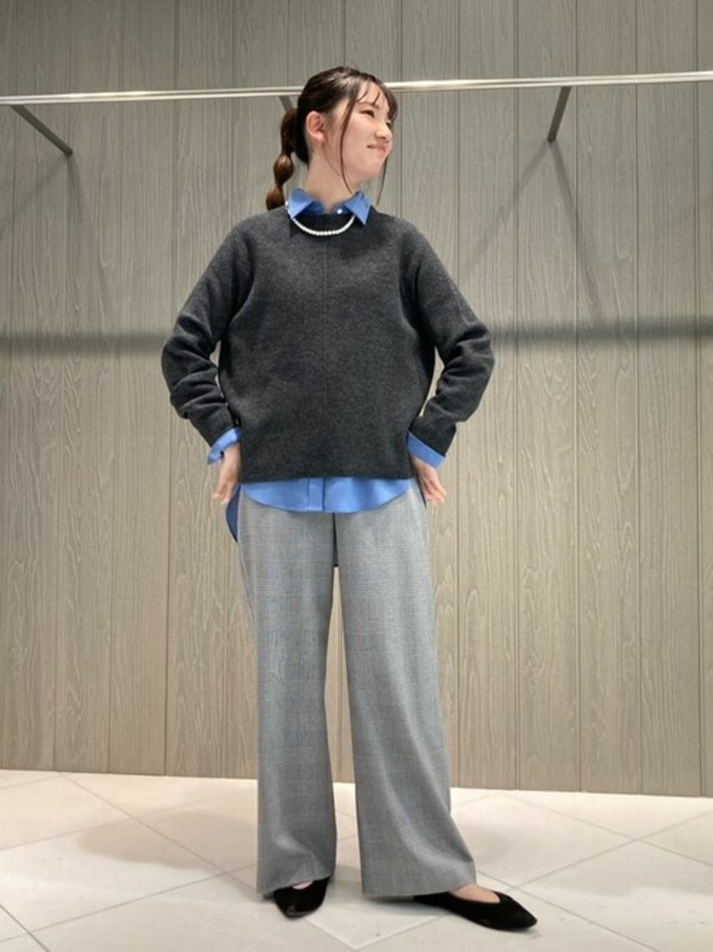 チェックのワイドパンツは広がりすぎず落ち感がキレイです。 後ろゴムなのでストレスフリーにお召しいただけます!