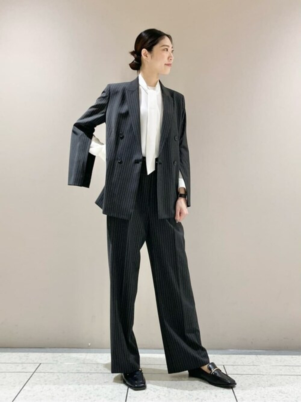 きちんと感のあるストライプのセットアップコーディネートです。 ジャケットは袖口にコンシールファスナーが付いており、雰囲気を変えてお召しいただけます。